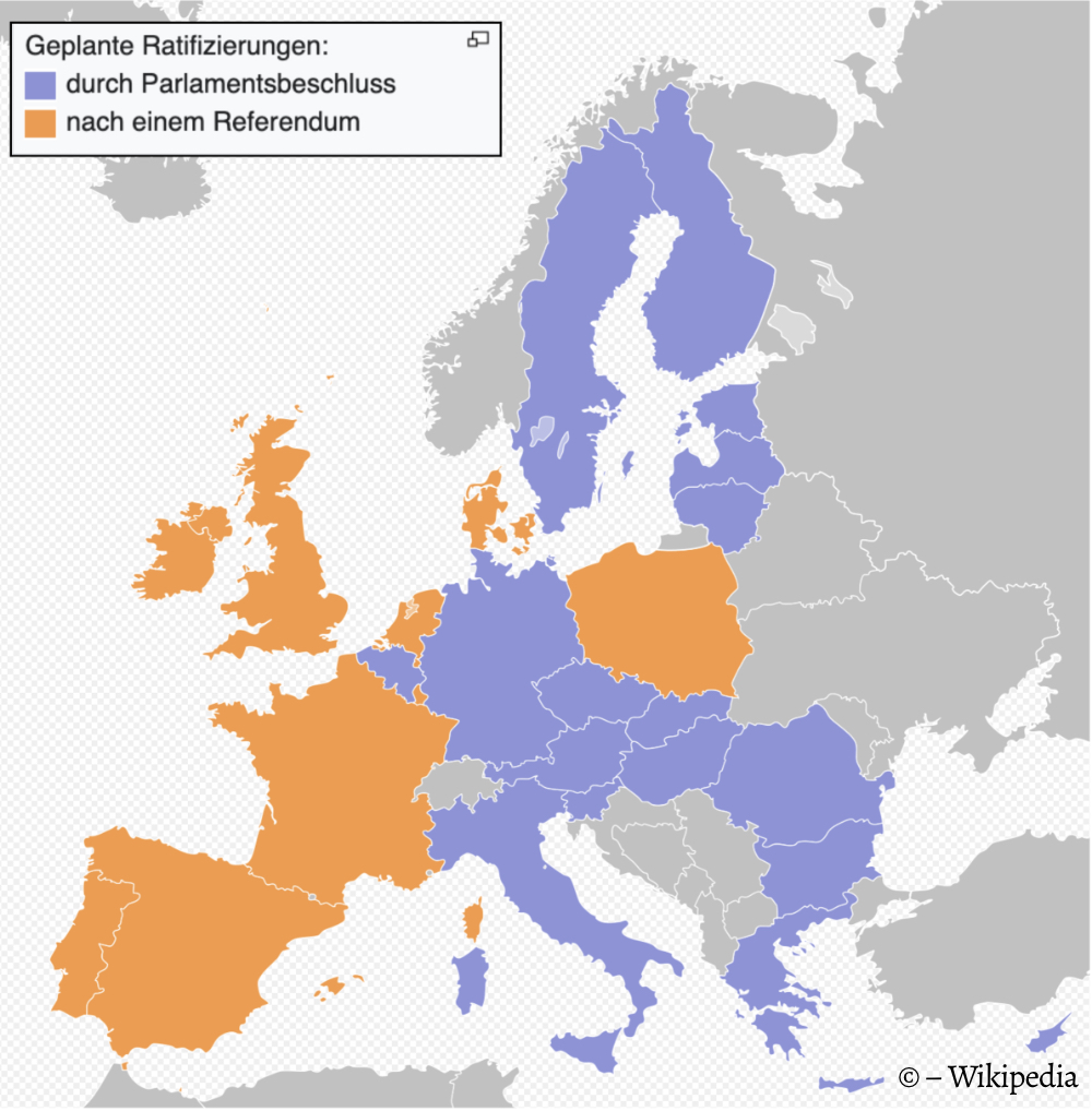2004. Der europäische Verfassungskonvent hatte – unter der Leitung von Valéry Giscard d'Estaing einen Entwurf erarbeitet. Die Regierungen hatten sich darauf geeinigt! Während die Mehrheit der EU-Mitgliedstaaten sich mit einer parlamentarischen Ratifizierung des „Vertrages über eine Verfassung für Europa” begnügt hätten, sollten in sieben Ländern Volksabstimmungen das Vertragswerk bestätigen! Ja, was kann da schon schiefgehen!